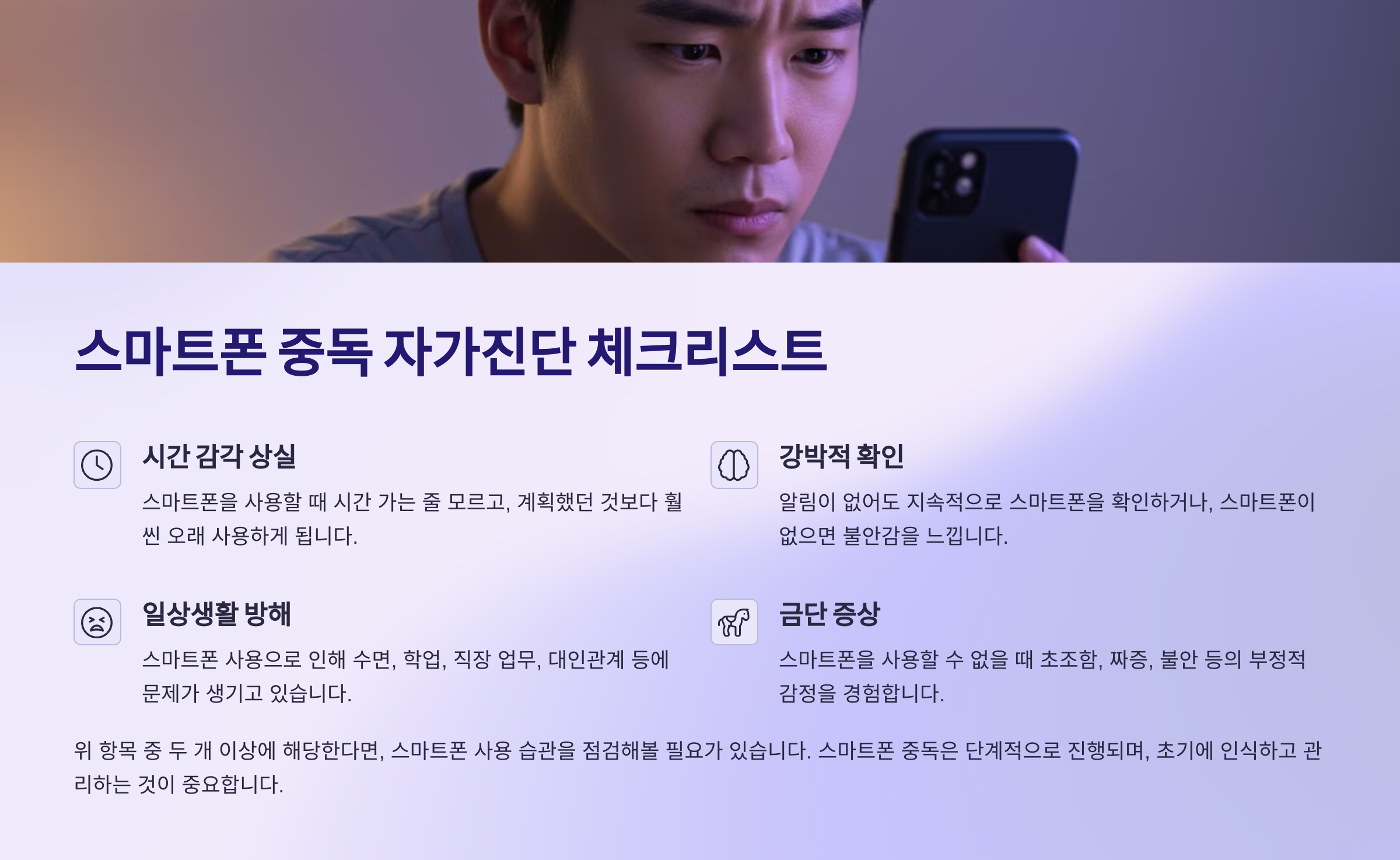 이 글에서는 스스로 진단할 수 있는 체크리스트부터, 실생활에서 적용할 수 있는 중독 탈출 팁까지 준비했어요. 나도 예전에 알람 울릴 때마다 무조건 폰을 들여다보던 시절이 있었는데, 지금은 화면보다 하늘을 더 자주 봐요. 우리 함께 줄여봐요, 스마트폰! 🌿