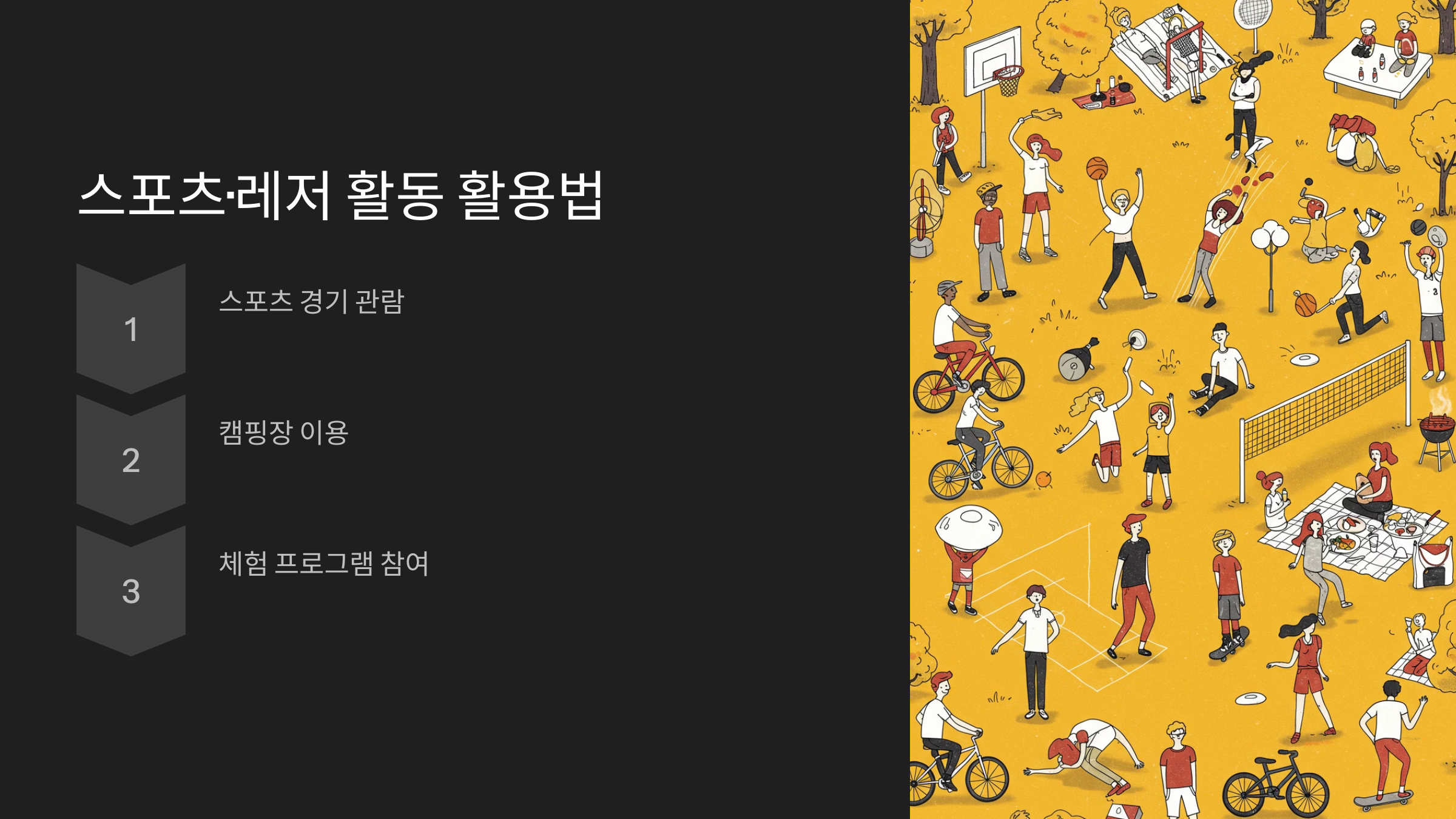- 스포츠 경기 관람 (야구, 축구, 농구 등)