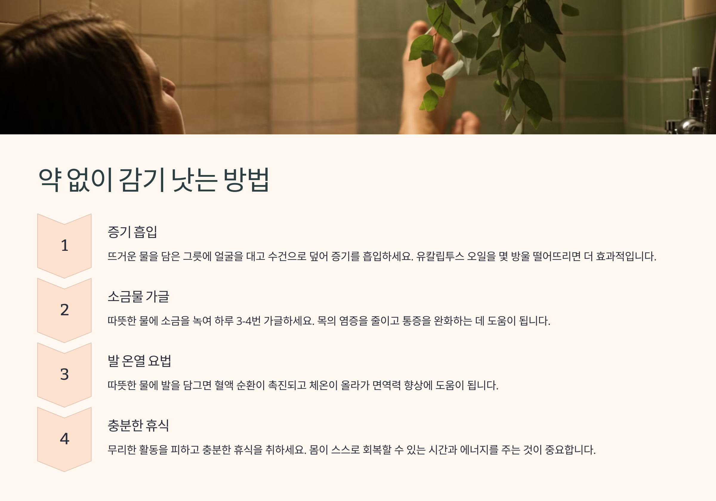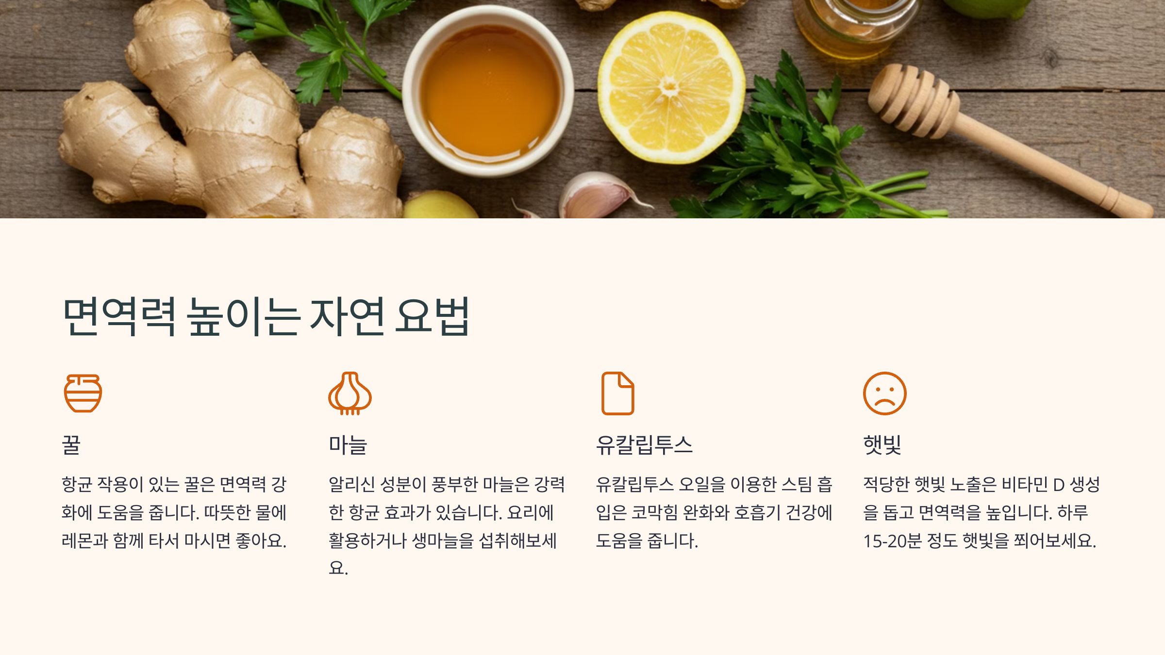 - 자연 요법 활용하기 (생강차, 꿀물 등)