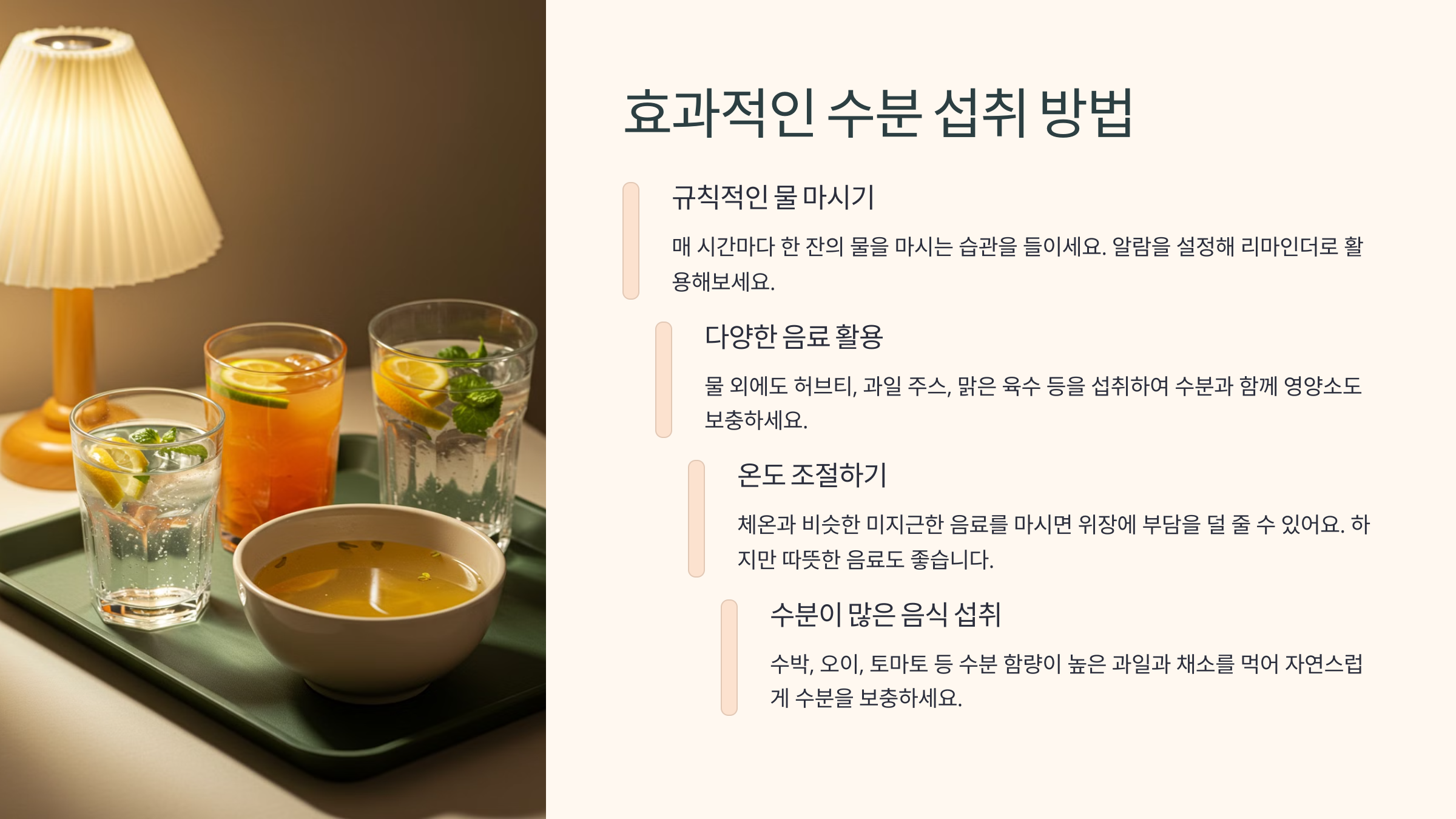 수분은 감기몸살을 이겨내는 데 필수적인 요소입니다. 탈수를 방지하고 몸속 노폐물을 배출하여 회복을 돕는 역할을 합니다.
