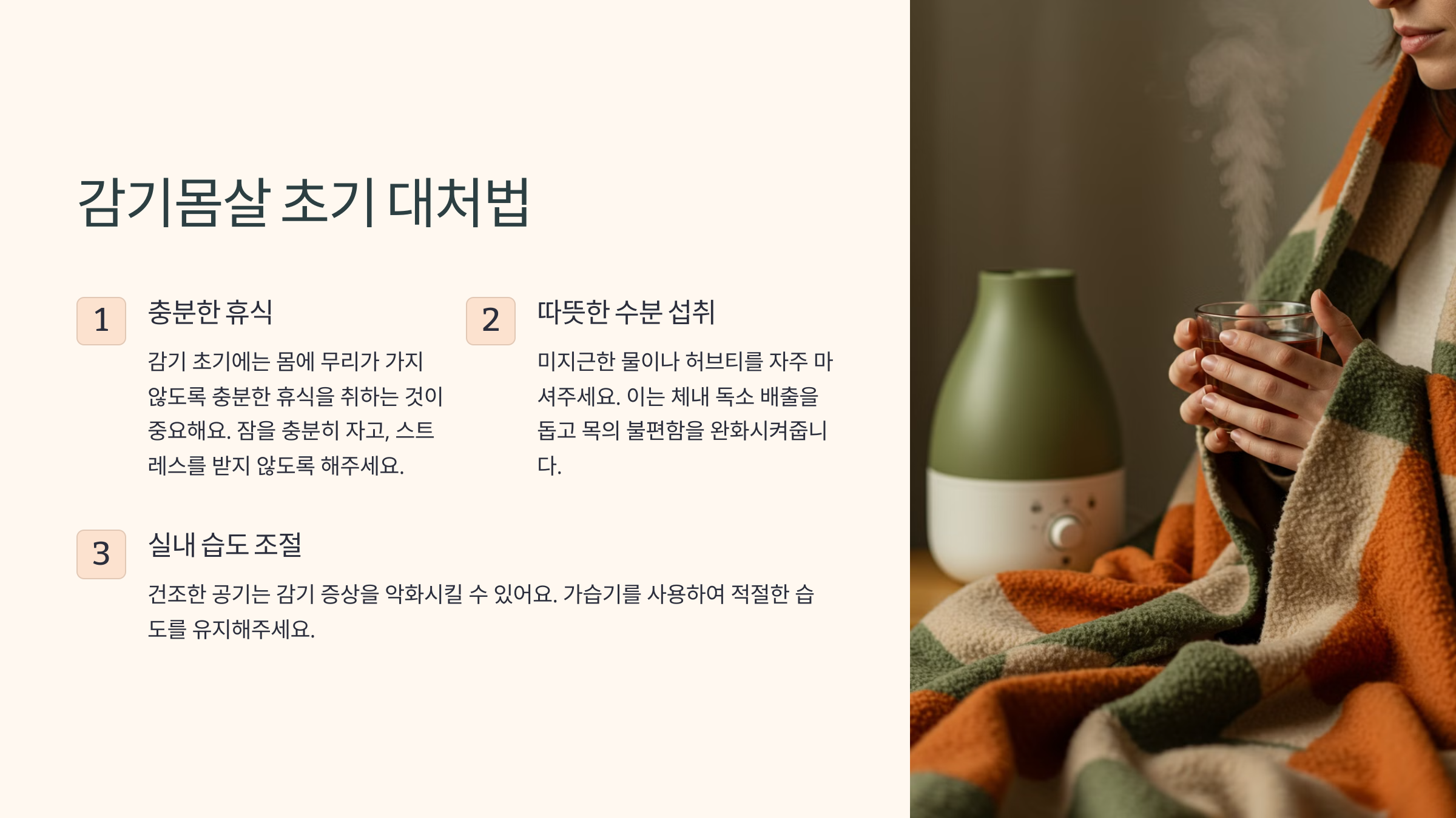 감기몸살은 초기 대처가 매우 중요합니다. 감기 초기에는 몸이 으슬으슬 춥거나 피곤함이 몰려오는 등 전조 증상이 나타나는데, 이 시기에 적절한 조치를 취하면 증상을 완화할 수 있습니다.
