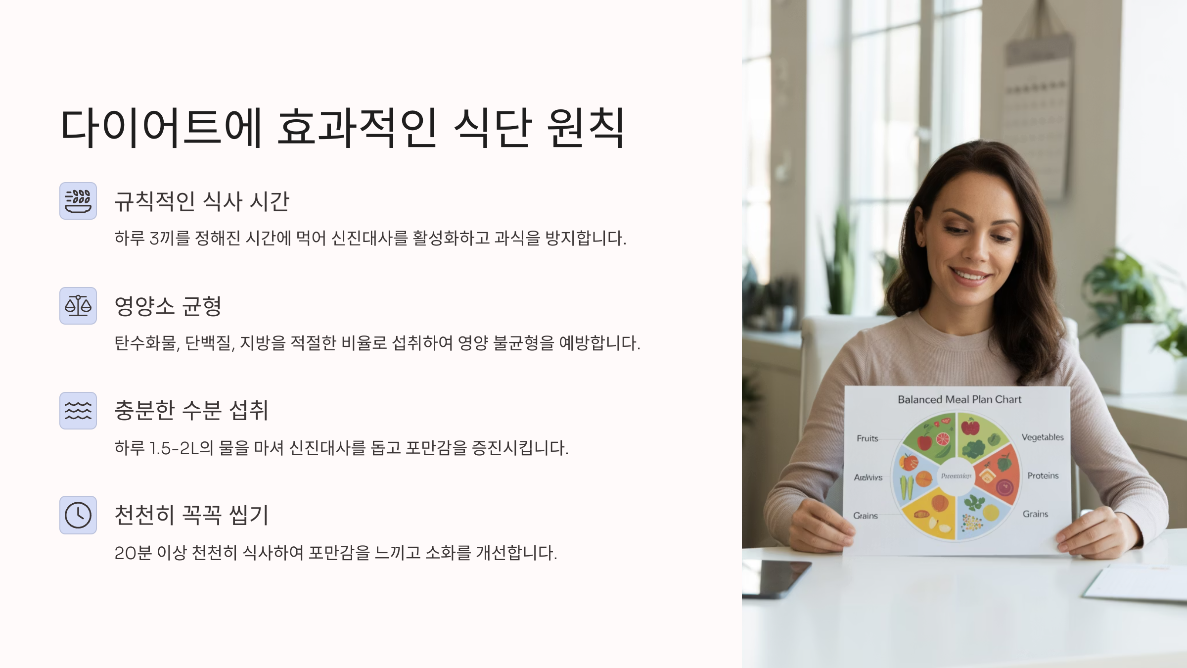또 하나의 원칙은 식사 시간을 일정하게 유지하는 거예요. 공복 시간이 너무 길어지면 폭식하게 되거나 기초대사량이 떨어져 체중 감량에 방해가 돼요.