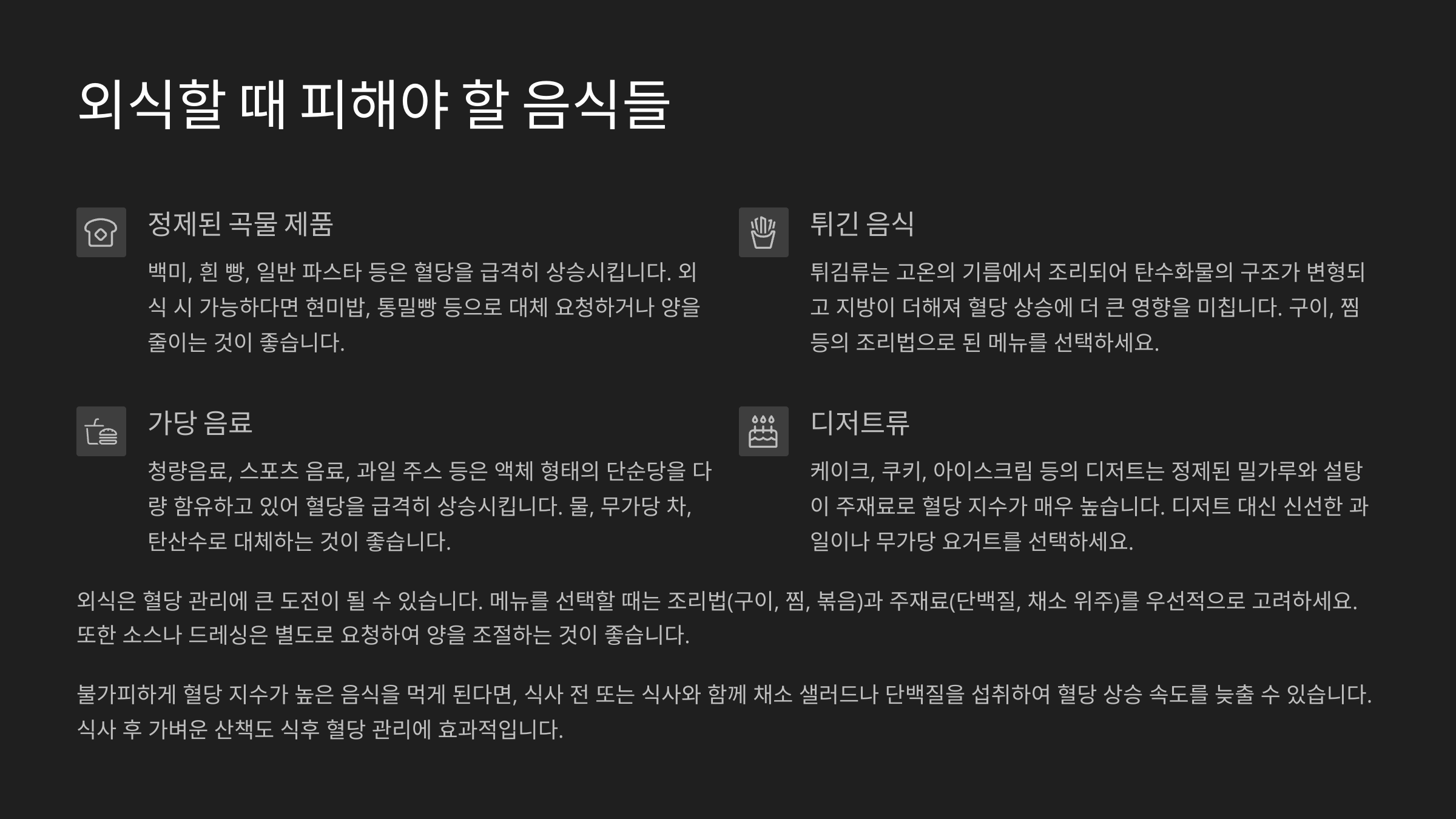 | 튀김류 (치킨, 돈가스 등) | 고지방 + 고열량 + 혈당 변동 유발 | 구운 생선, 닭가슴살 |
